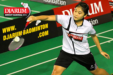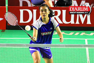 Marsa Indah (PB Djarum) mengembalikan shuttlecock ke arah Tia Sari (SGS PLN)