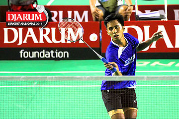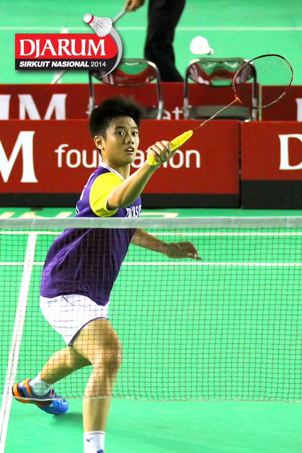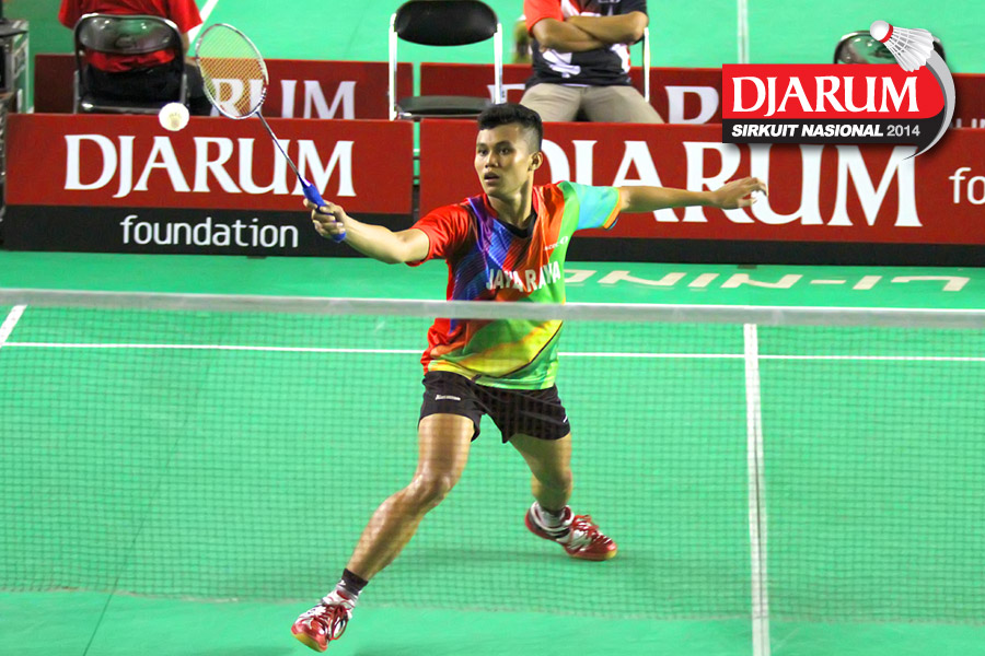 R. Eka Fajar (Jaya Raya) mengembalikan shuttlecock ke arah Alamsyah Yunus (JR Enkei)