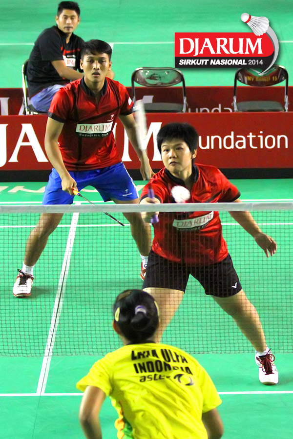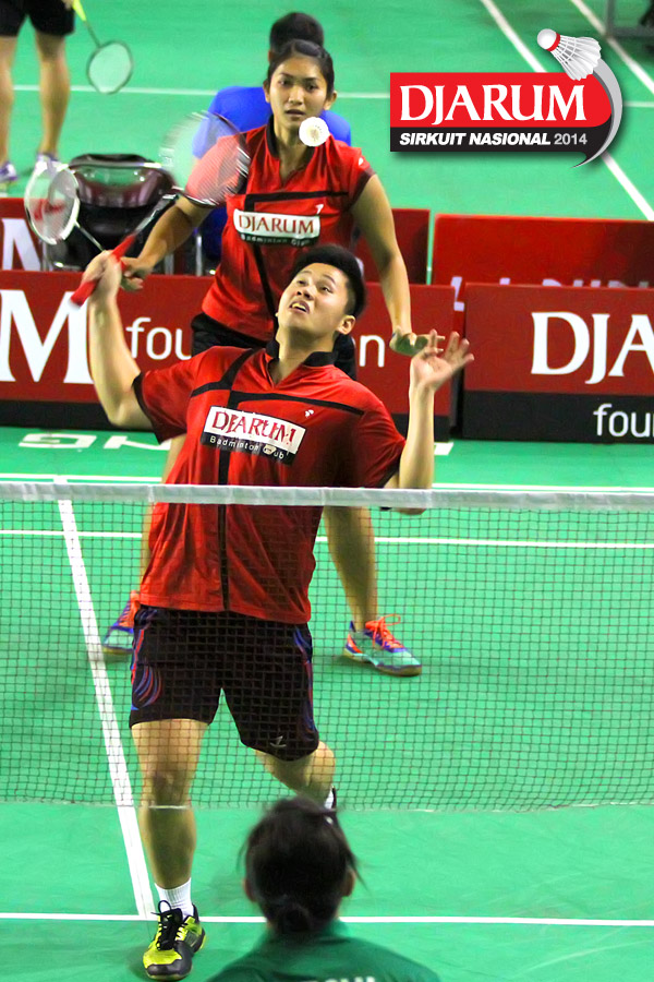 Ricky Alverino/Ristya Ayu (PB Djarum) bersiap menghadang serangan yang dilepaskan Joko Aji/Siti Wahyuni (Tangkas)
