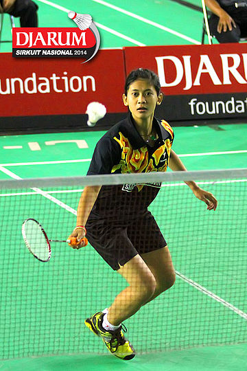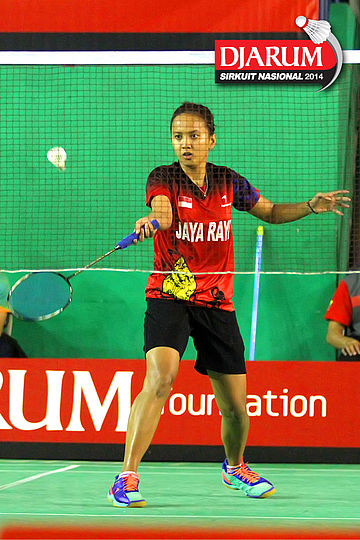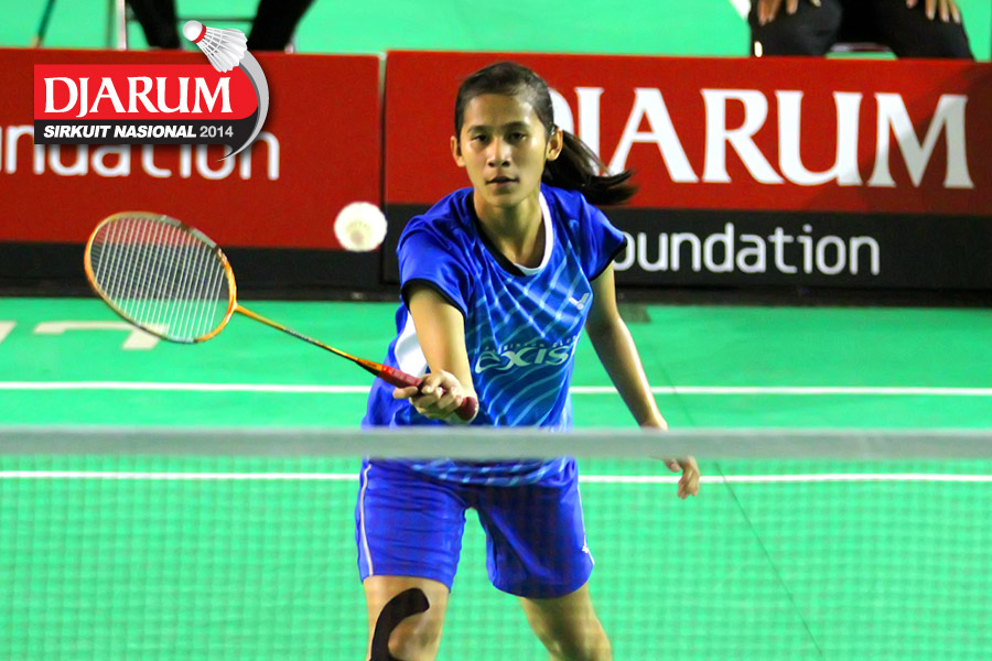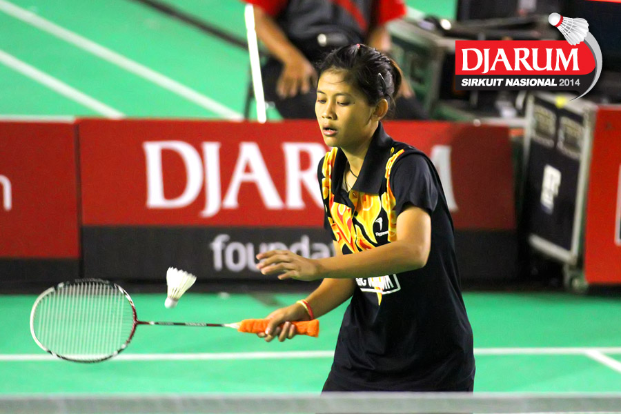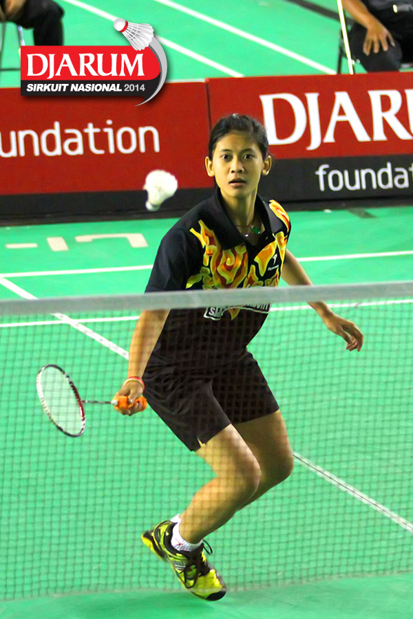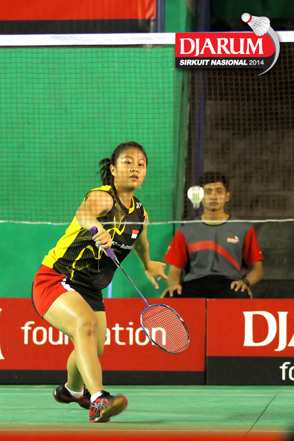 Rusydina Antardayu (Tangkas) bersiap mengembalikan shuttlecock ke arah Rena Suwarno (Jaya Raya)