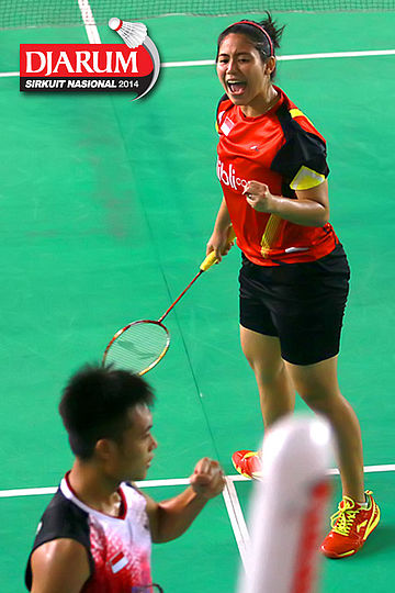 Ekspresi Hafiz Faisal dan Shela Devi (Pelatnas) setelah memastikan diri menjadi juara di ganda campuran dewasa
