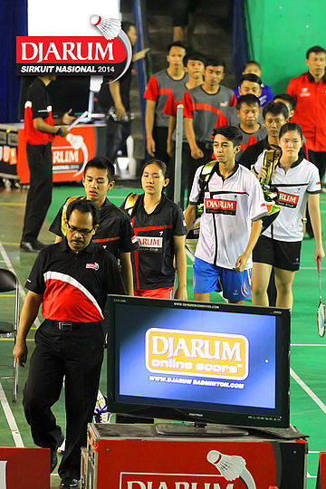 Dua pasangan ganda campuran remaja PB Djarum, Akbar Gusti/Serena Kani dan Andika Ramadiansyah/Mychelle Crhystine saat memasuki lapangan pertandingan