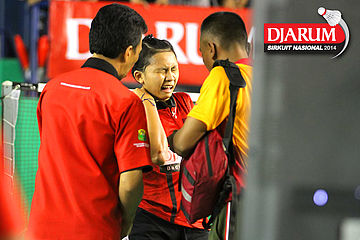 Pemain tunggal remaja putri PB Djarum, Putri Ayu (tengah) saat menerima penanganan medis