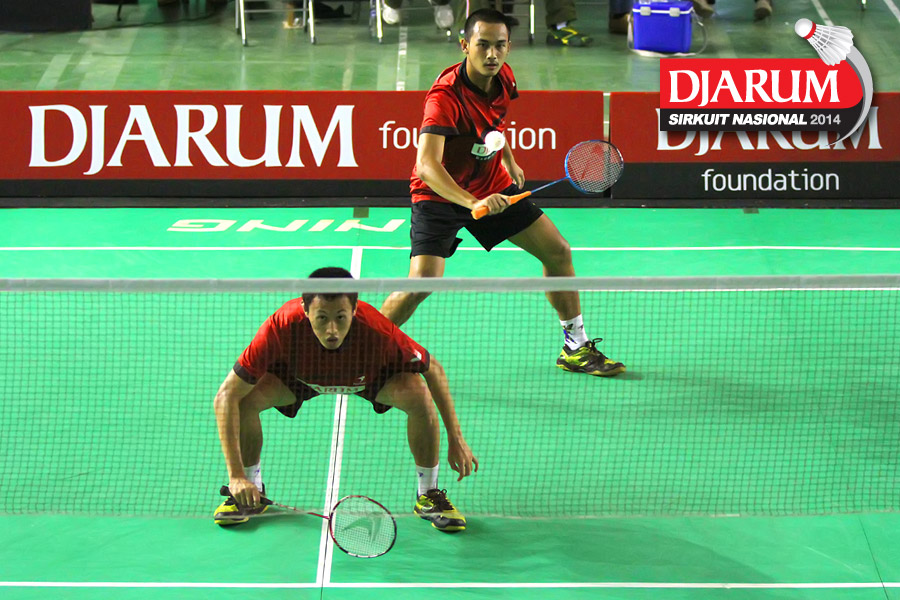 Angger Sudrajat/Tedi Supriadi (PB Djarum) bersiap menghadang serangan yang dilepaskan Alwi Mahardika/Felix Eka (Exist)