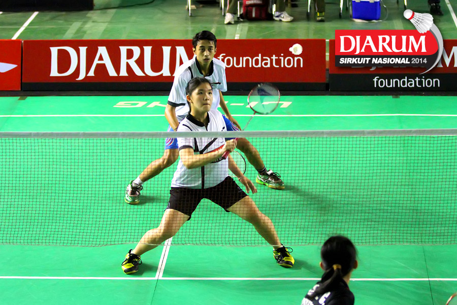 Akbar Gusti/Serena Kani (PB Djarum) bersiap menghadang pengembalian dari Andika Ramadiansyah/Mychelle Crhystine (PB Djarum)