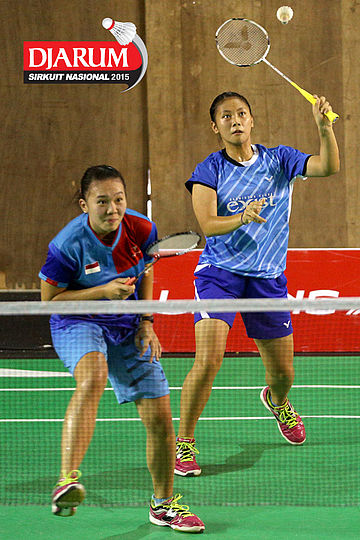 Lukhi Apri/Zakia Ulfa (Pelatnas) menyambar pengembalian dari Erwin Rendana/Dewi Setya (Bayu Kencana).