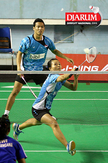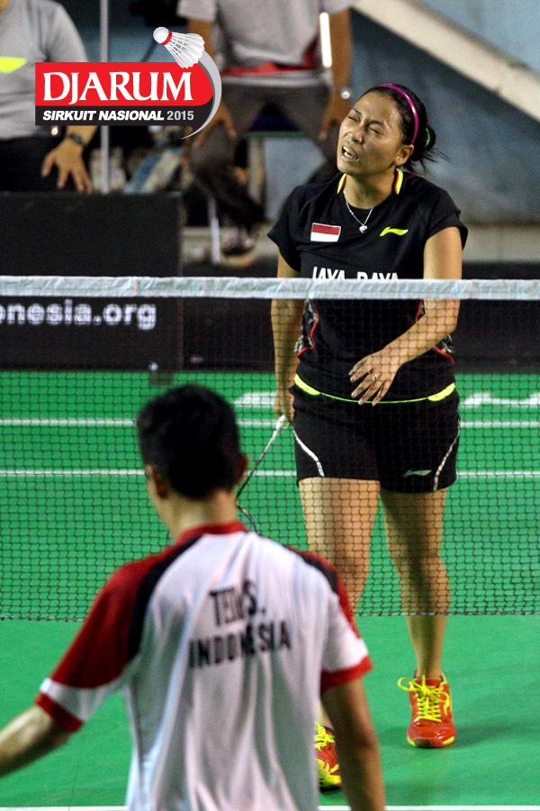 Tedi Supriadi/Ririn Amelia (Djarum Kudus) mengembalikan shuttlecock ke arah Irfan Fadilah/Pia Zebadiah (Jaya Raya).