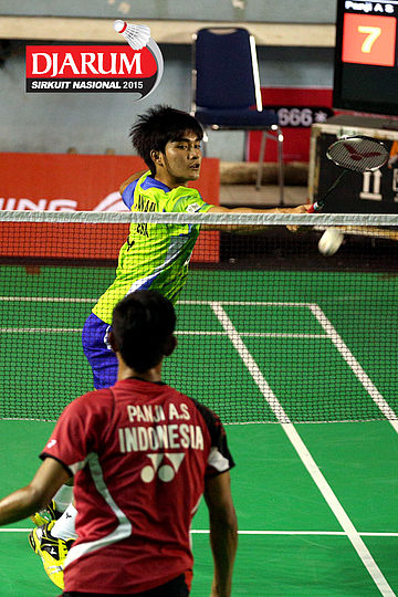 Panji Akbar (Pelita Bakrie) bersiap menyambar pengembalian dari Panji Ahmad (Pelatnas).