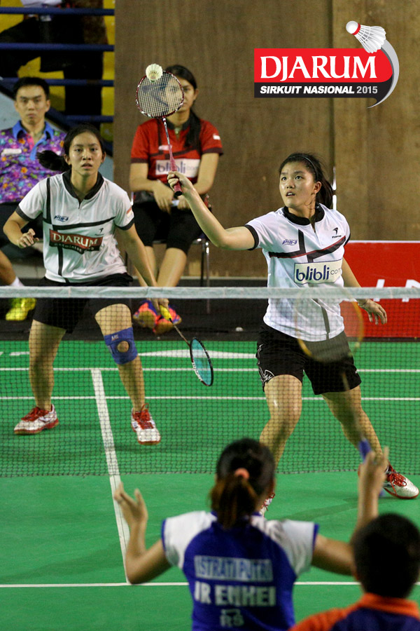 Mychelle Crhystine/Serena Kani (Djarum Kudus) menyambar pengembalian dari Aliana Kurniawati/Istrati Putri (Candra Wijaya/JR Enkei).