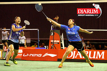 Pia Zebadiah/Weni Anggraini (Jaya Raya) menyambar pengembalian dari Dian Fitriani/Nadya Melati (Pertamina Fastron).
