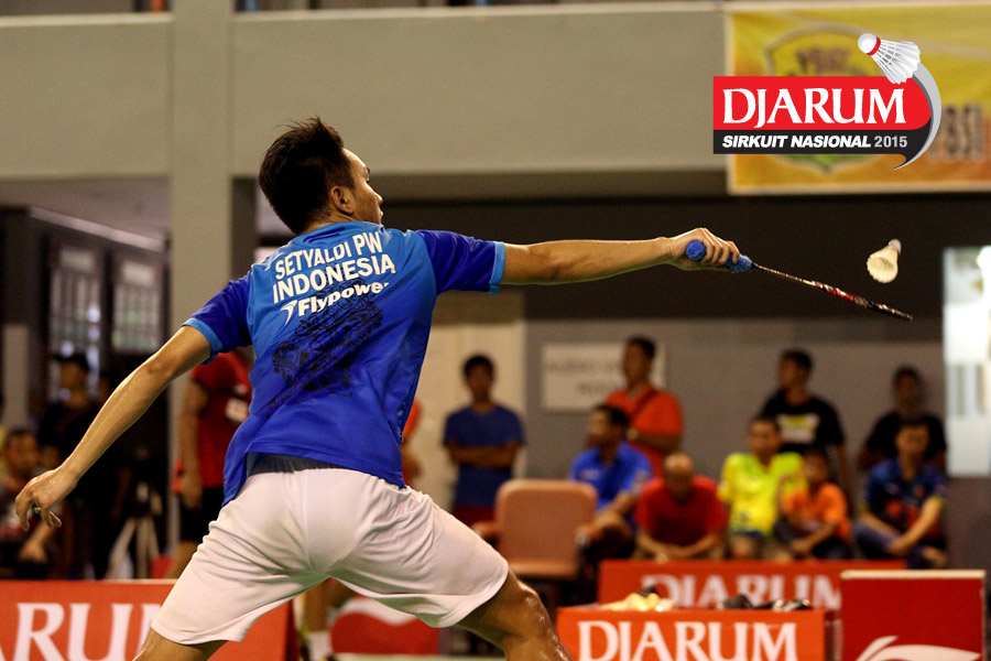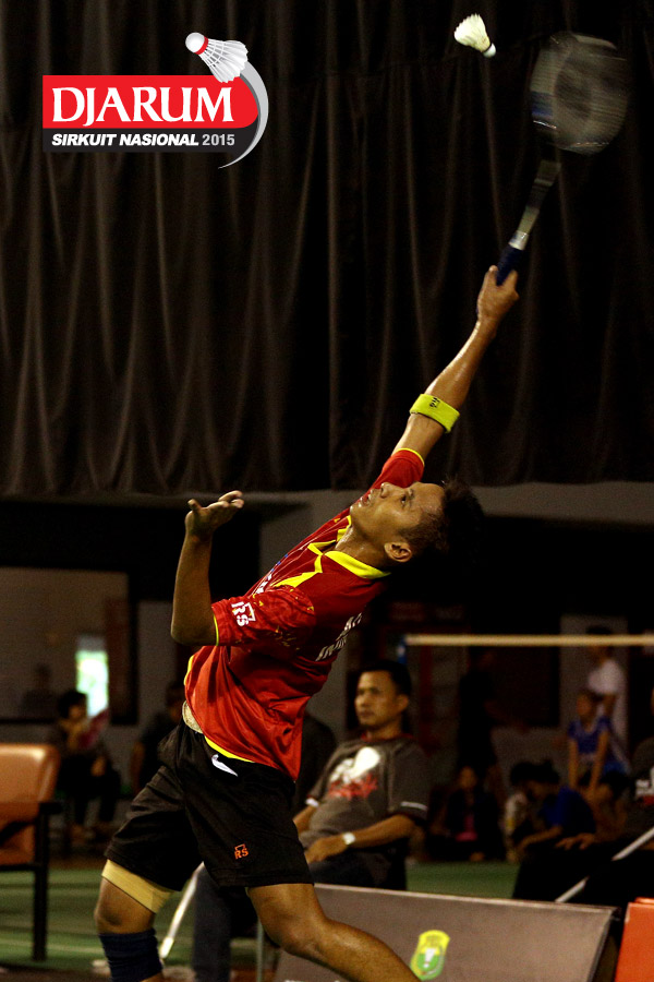 Setyaldi Putra (Guna Dharma) mengembalikan shuttlecock ke arah Alamsyah Yunus (JR Enkei).