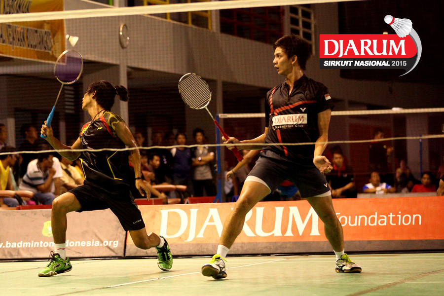 Agripina Prima/Andrei Adistia (Djarum Kudus) menghadang pengembalian dari Fran Kurniawan/Trikusuma Wardhana (Djarum Kudus/Suryanaga).