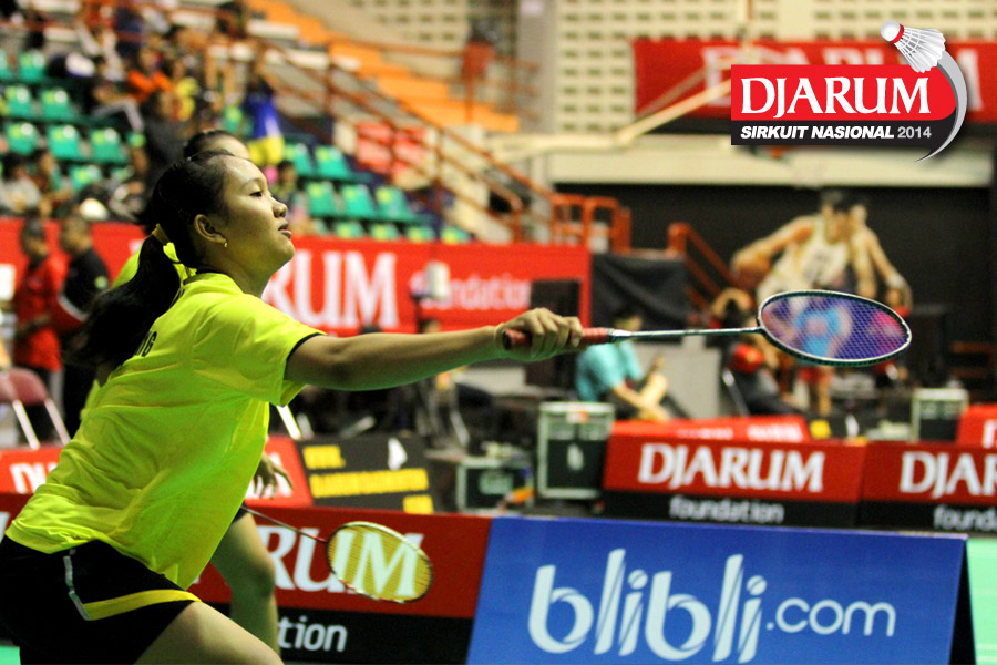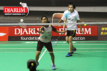 Indah/Jesika Melia (PPLP Jateng) mengembalikan shuttlecock ke arah Desi/Fitri (Fifa Badminton).