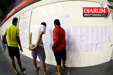 Tiga atlet saat melihat hasil kualifikasi Djarum Sirkuit Nasional Li-Ning Jawa Tengah Open 2014 di GOR Sritex.