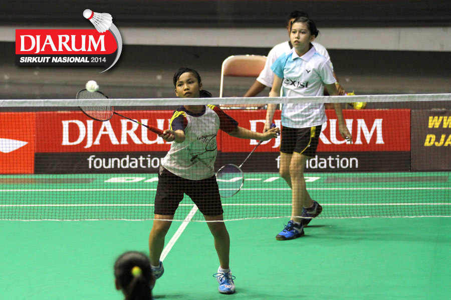 Diana Fitri Milenia / Ivanna Celia Handoyo (Santoso Jaya/Exist) mengembalikan shuttlecock ke arah Anissa Mubarokah / Pradini Septi Anggraeni (Fifa Badminton).