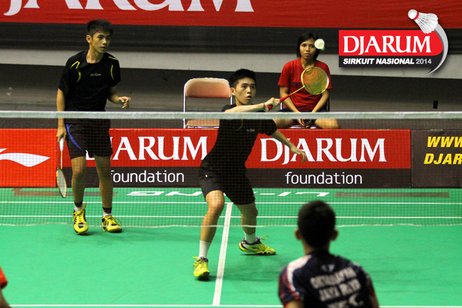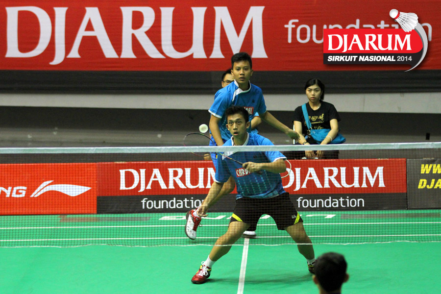 Felix/Yordan (Hi Qua Wima) bersiap menyambut pengembalian dari Hengky Nur Oktavian / Ridwan Firmansyah (Jaya Raya).