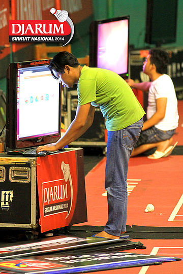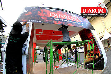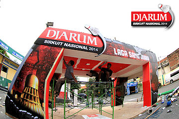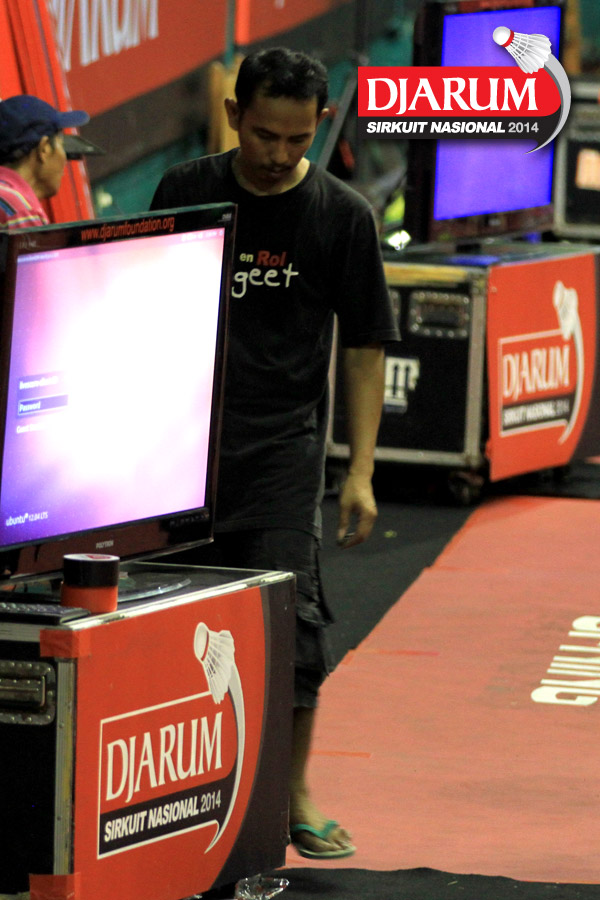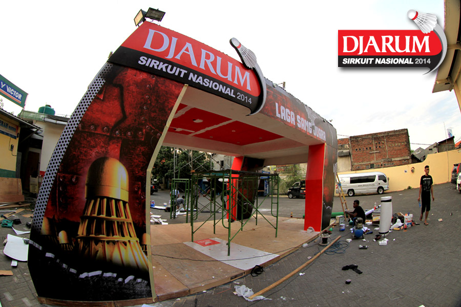 Persiapan penyelesaian dekorasi booth Djarum Sirkuit Nasional Li-Ning Open Jawa Timur Open 2014