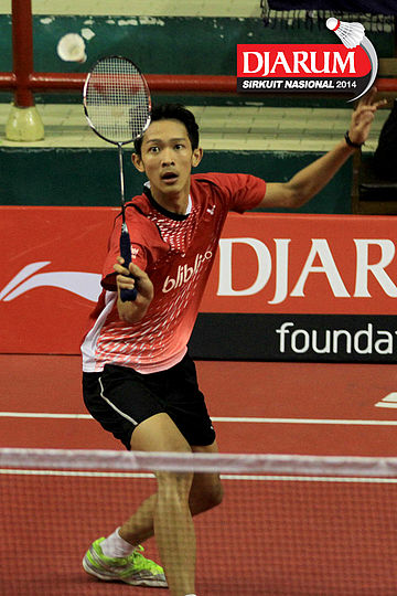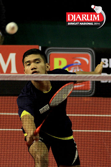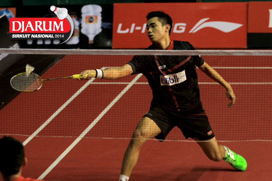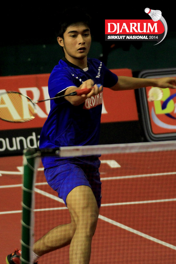 M. Bayu Pangisthu (Pelatnas) bersiap menyambar pengembalian dari M. Fajar Wikajaya (Pelatprov DKI Jakarta)