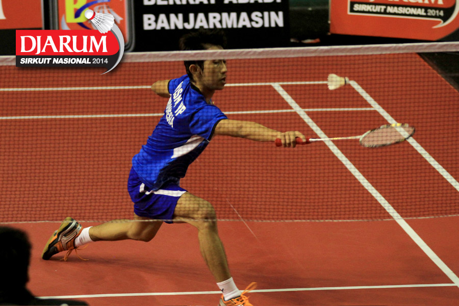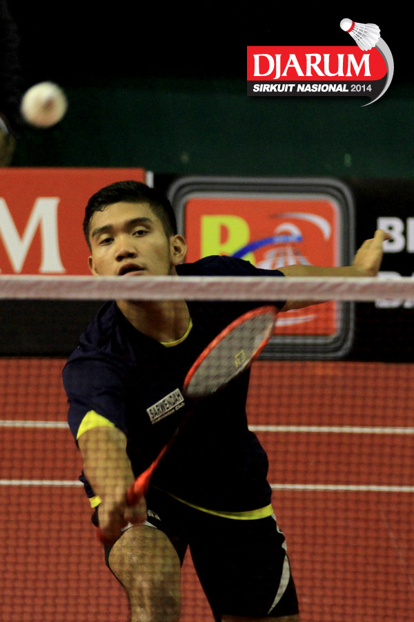 M. Bayu Pangisthu (Pelatnas) melepaskan smash ke arah M. Fajar Wikajaya (Pelatprov DKI Jakarta)
