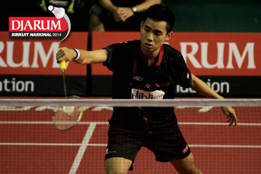Kho Henrikho (Djarum Kudus) menyambut serve dari Stevanno (Winner Badminton)