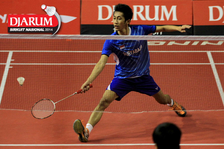 Wisnu Yuli (Suryabaja) mengembalikan shuttlecock ke arah Steven Wiliam (Hi Qua Wima)