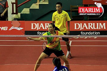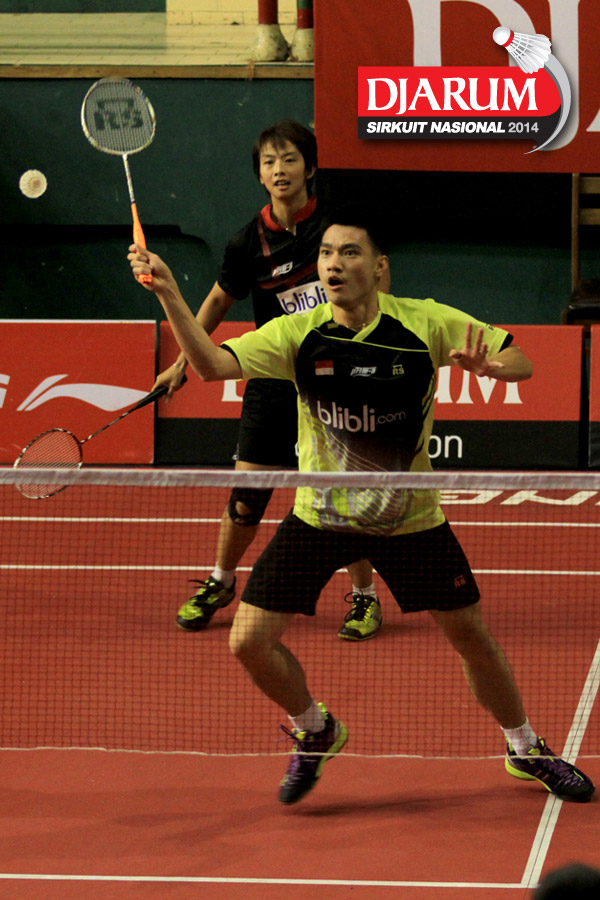 Wahyu Hariansyah/Novi (Candra Wijaya) bersiap menghadang pengembalian dari Deny Mamahit/Fransisca Rahardja (Exist)