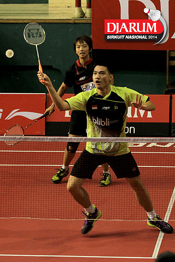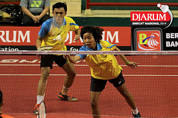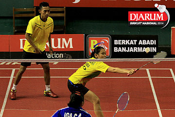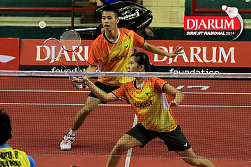 Wahyu Hariansyah/Novi (Candra Wijaya) menyambar pengembalian dari Deny Mamahit/Fransisca Rahardja (Exist)