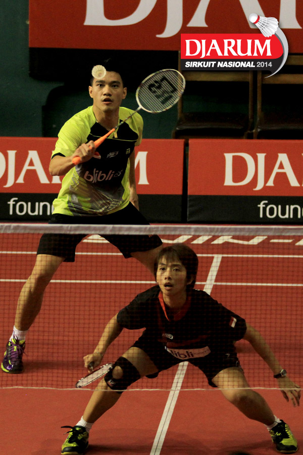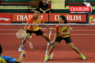 Ridho Akbar/Sri Wulan (Halim/Jaya Raya) bersiap menyambut pengembalian dari M. Takjul/Iga Chusnul (Bayu Kencana)