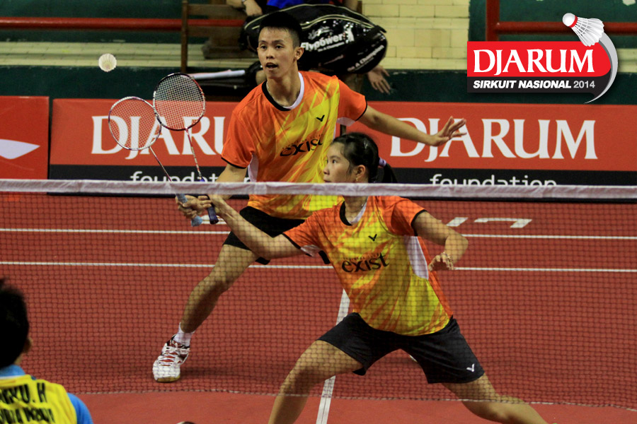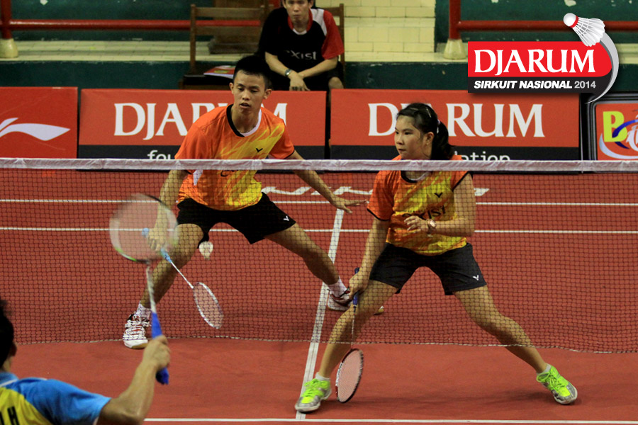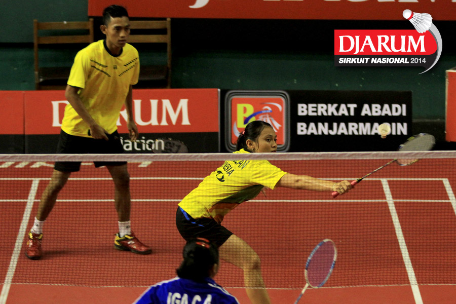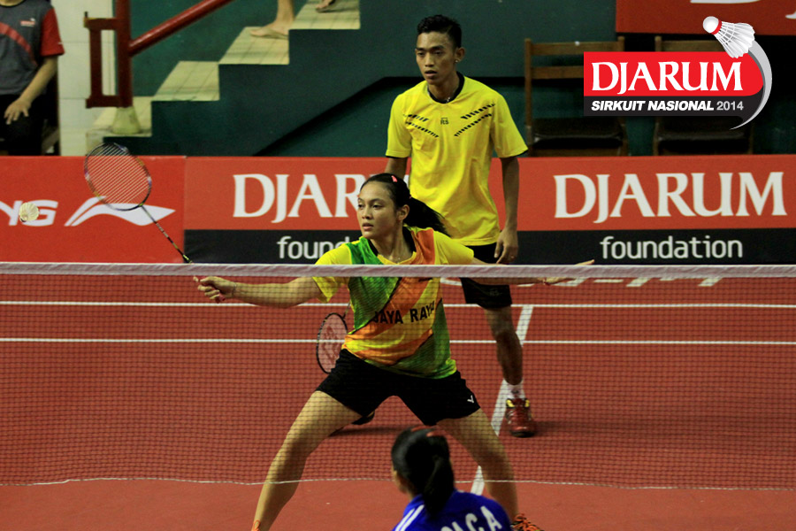 Ridho Akbar/Sri Wulan (Halim/Jaya Raya) mengembalikan shuttlecock ke arah M. Takjul/Iga Chusnul (Bayu Kencana)