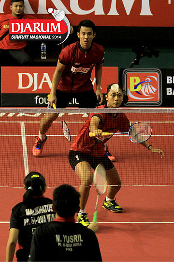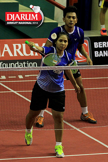 Indra Setiawan/Ganis Nurrahmandani (Pertamina Fastron) menyambut serve dari M. Maftuki/Cindy Ong (Pelatprov DKI Jakarta/Malibu)