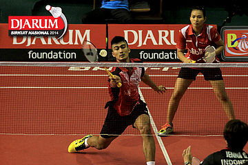 Indra Setiawan/Ganis Nurrahmandani (Pertamina Fastron) bersiap menyambar pengembalian dari M. Maftuki/Cindy Ong (Pelatprov DKI Jakarta/Malibu)