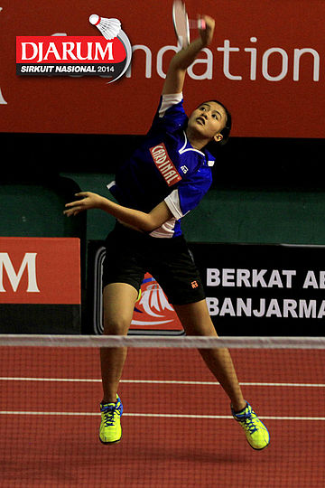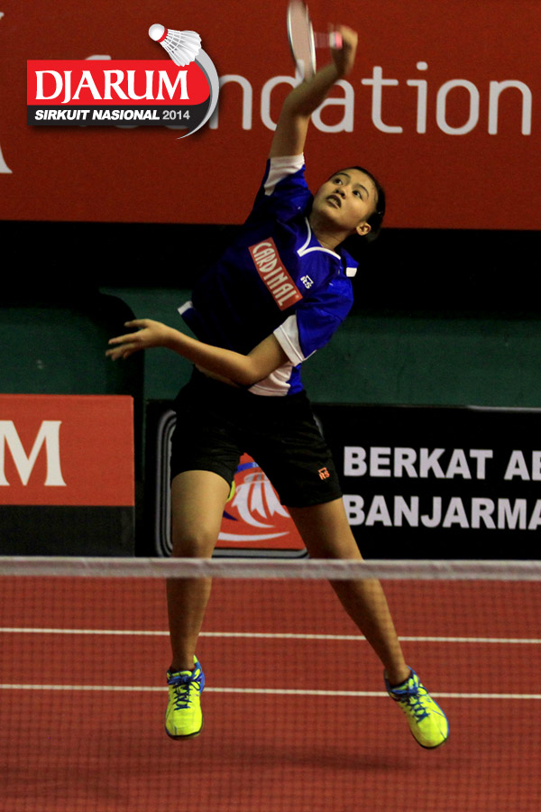 Mayrina Lukmanda (Mutiara Cardinal) melepaskan smash ke arah Nila Teza (Suluh Ardhi)