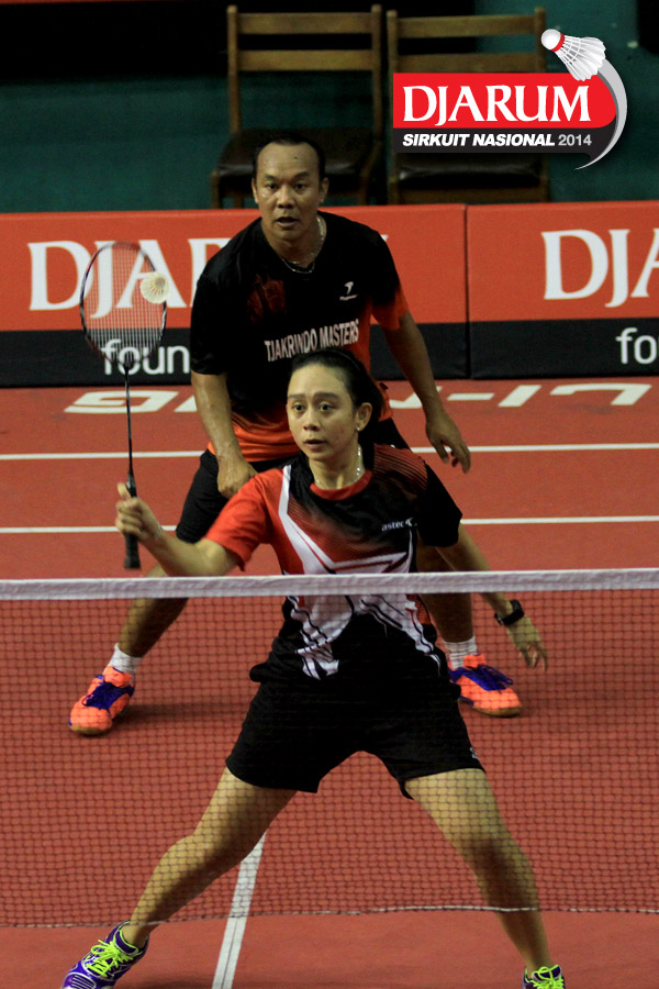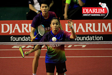 Trikus Haryanto/Keshya Nurvita Hanadia (Tjakrindo Masters/SGS PLN) mengembalikan shuttlecock ke arah Hafiz Faisal/Shella Devi (Pelatnas)