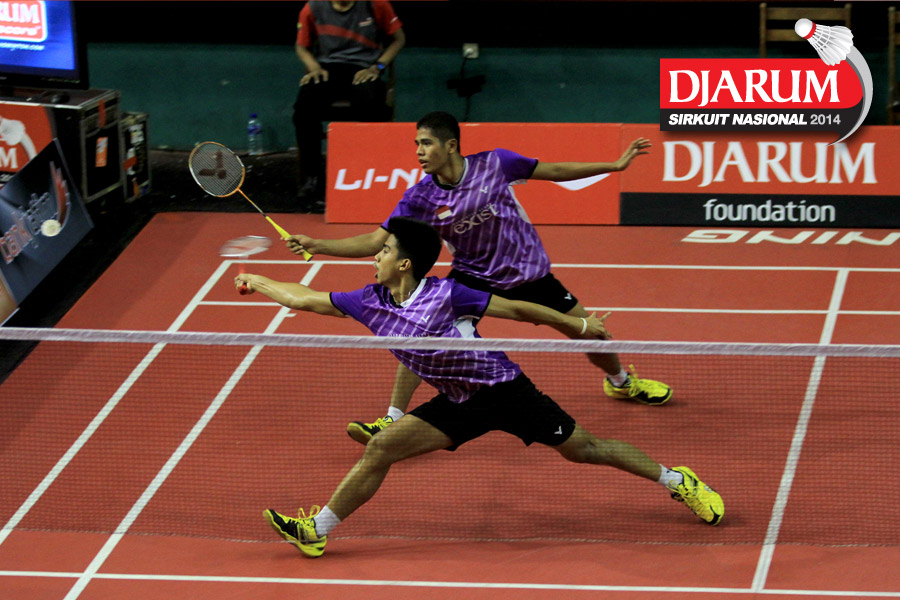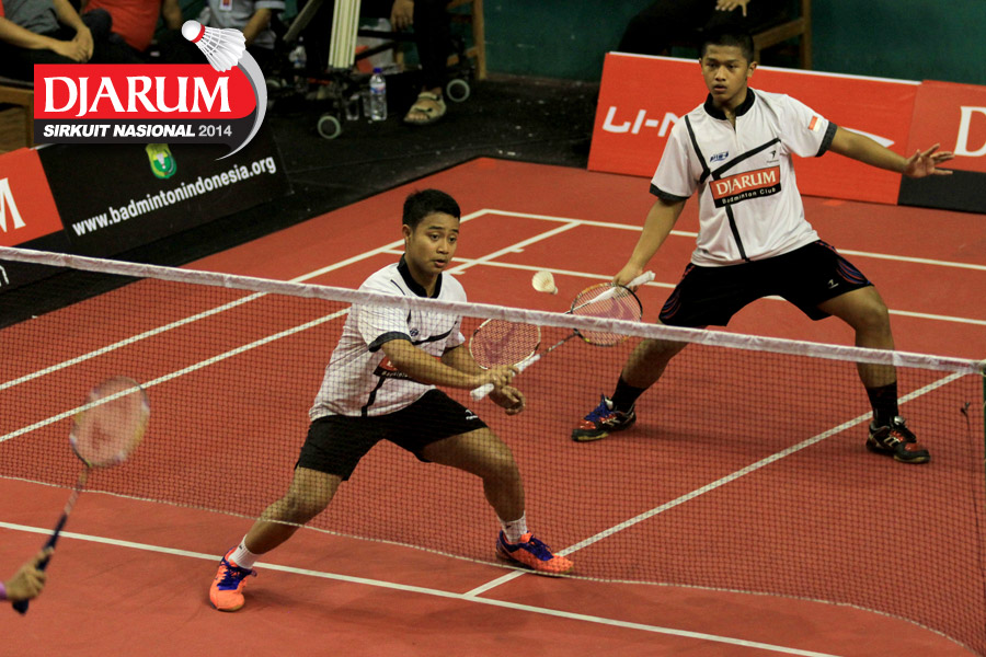 Dicky Cahya/M. Taufiqul (Djarum Kudus) bersiap menyambut pengembalian dari Bagas Maulana/Calvin Kristanto (Djarum Kudus)