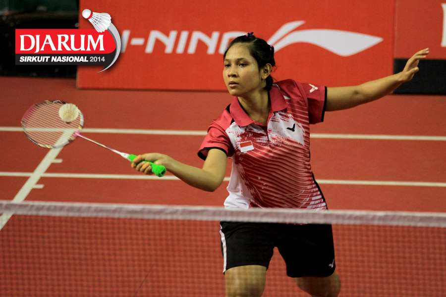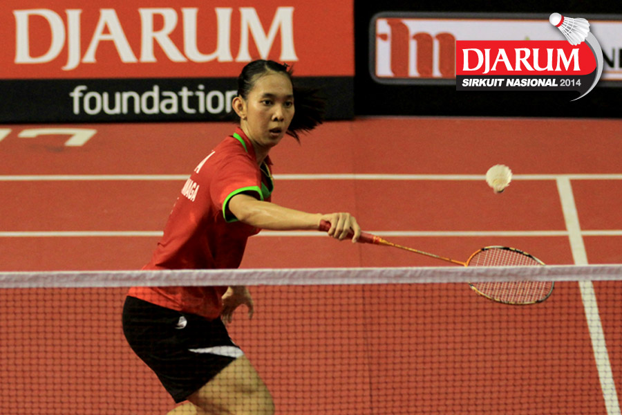 Ganis Nurrahmandani (Pertamina Fastron) mengembalikan shuttlecock ke arah Tike Arieda (Jaya Raya Suryanaga)
