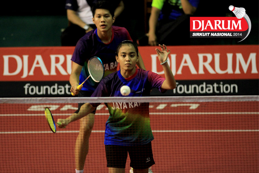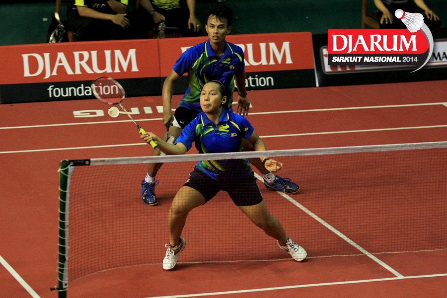 Achmad Fasich/Tays Rona (Citra Raya Unesa) bersiap mengembalikan shuttlecock ke arah Fachryza Abimanyu/Syifa Fauziah (Jaya Raya)