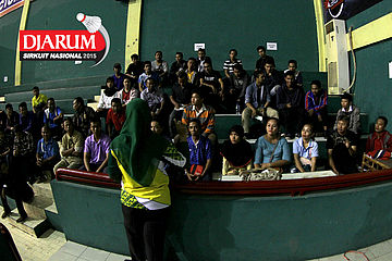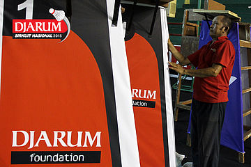 Salah satu pekerja saat memasang perlengkapan Djarum Sirkuit Nasional Li-Ning Jawa Timur Open 2015