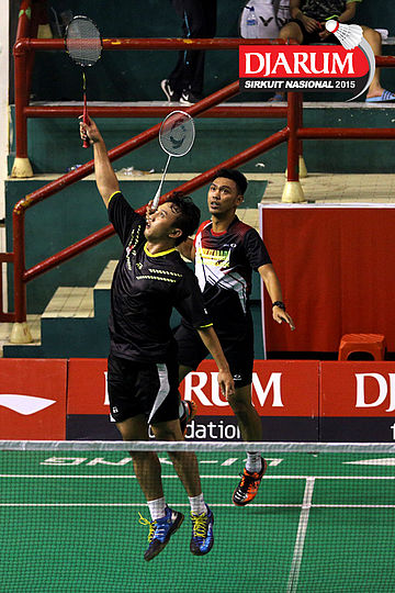 Ardiansyah Putra/Trikusuma Wardhana (Berkat Abadi/Exist) mengembalikan shuttlecock