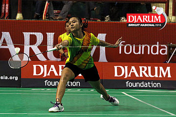 Shesar Hiren (Djarum Kudus) mengembalikan shuttlecock