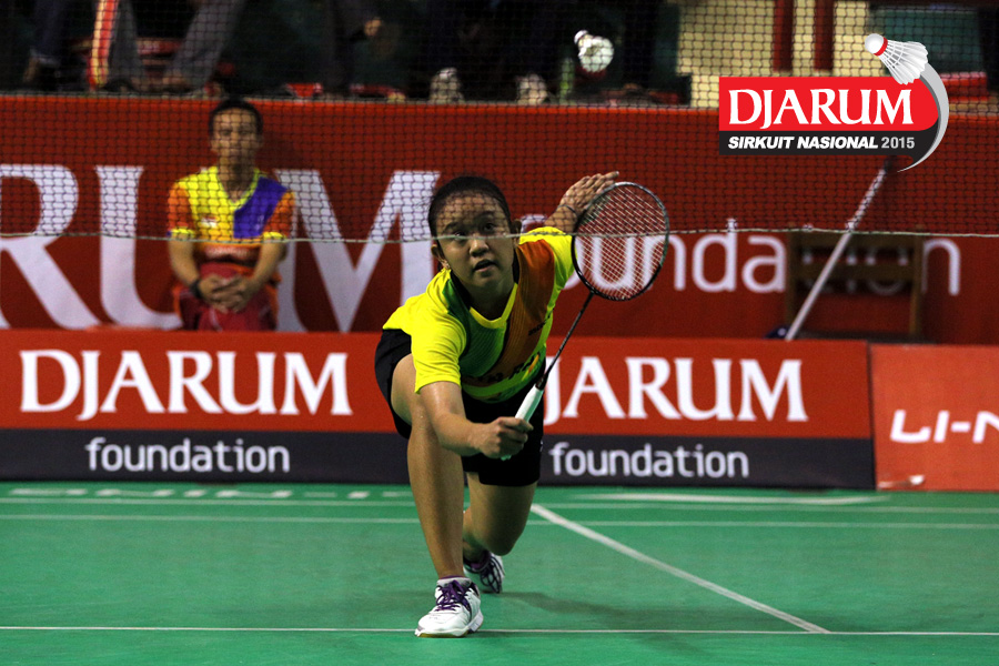 Aurum Oktavia (Jaya Raya) terjatuh saat berusaha mengembalikan shuttlecock