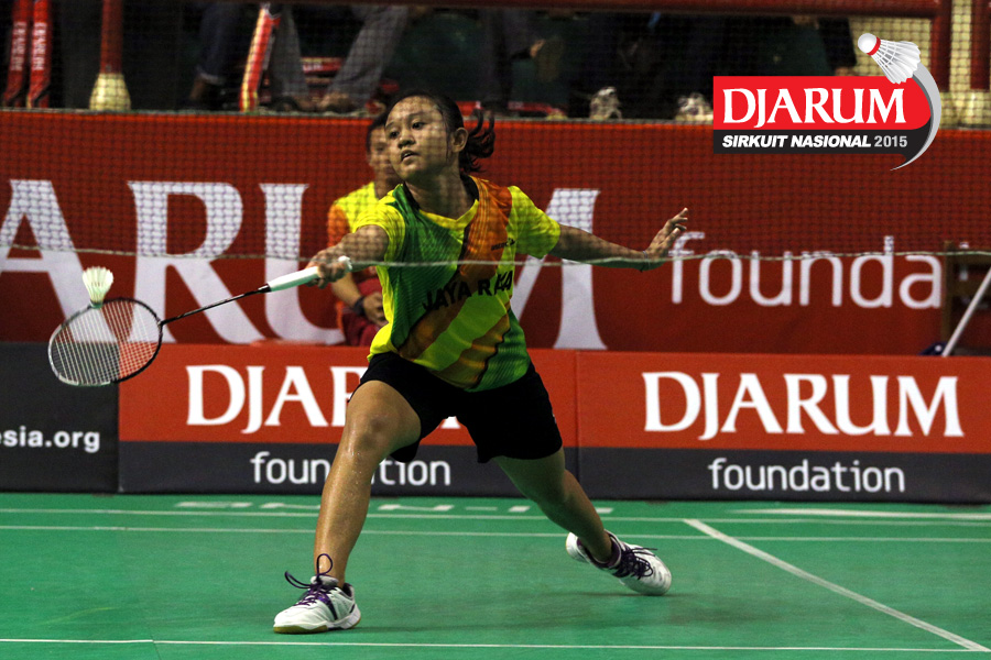 Aurum Oktavia (Jaya Raya) mengembalikan shuttlecock