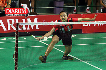 Aurum Oktavia (Jaya Raya) berusaha menggapai shuttlecock.