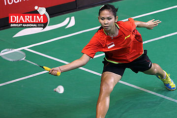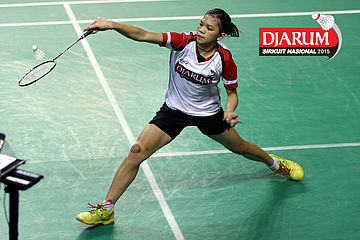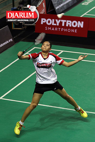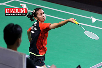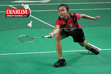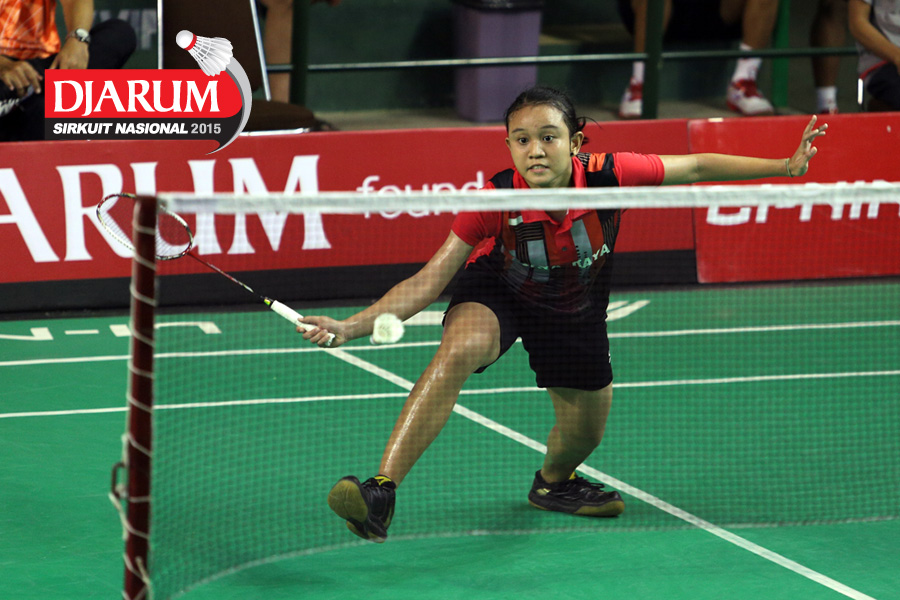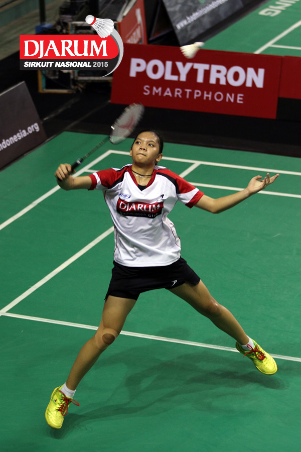 Alya Rahma (Djarum Kudus) mengembalikan shuttlecock.