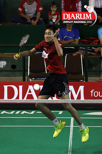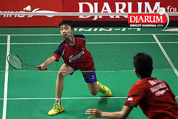 Alberto Alfin (Djarum Kudus) mengembalikan shuttlecock.