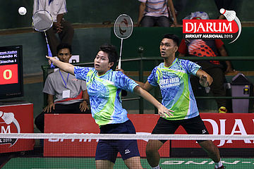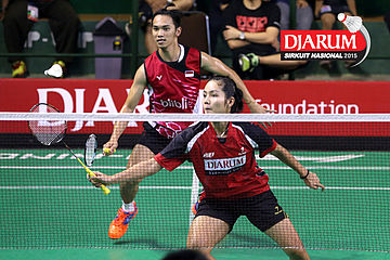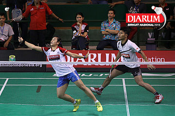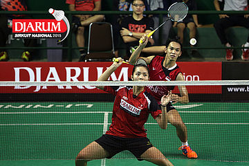 Ardy Nugroho/Lisa Ayu (Djarum Kudus) mengembalikan shuttlecock.