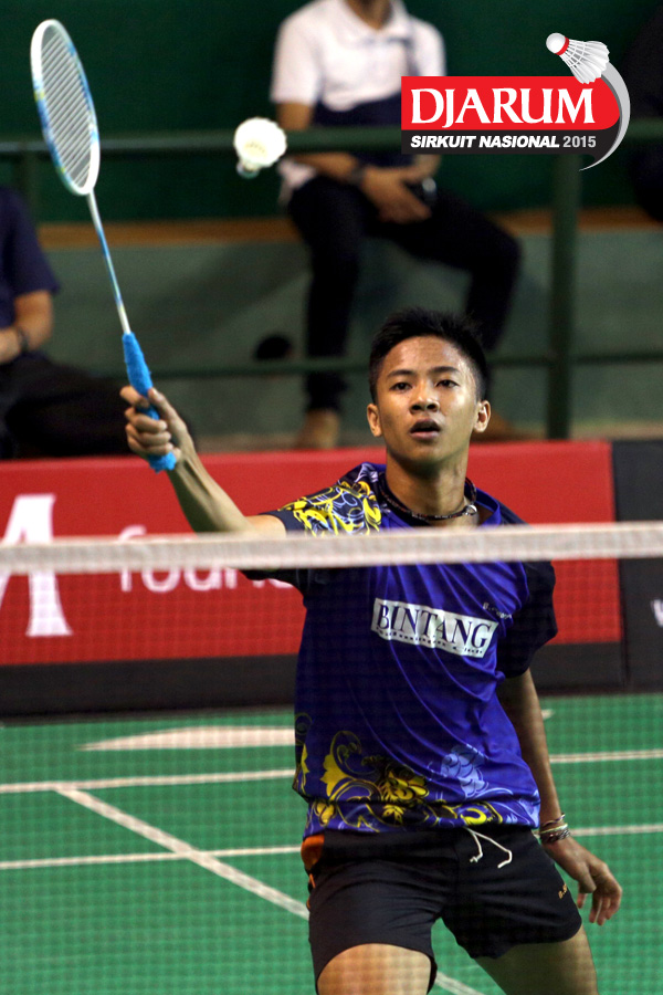 Dejan Ferdinansyah (Bintang BC) mengembalikan shuttlecock.