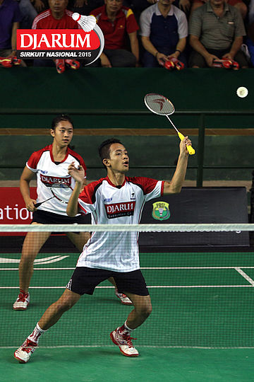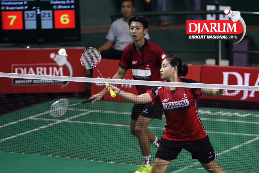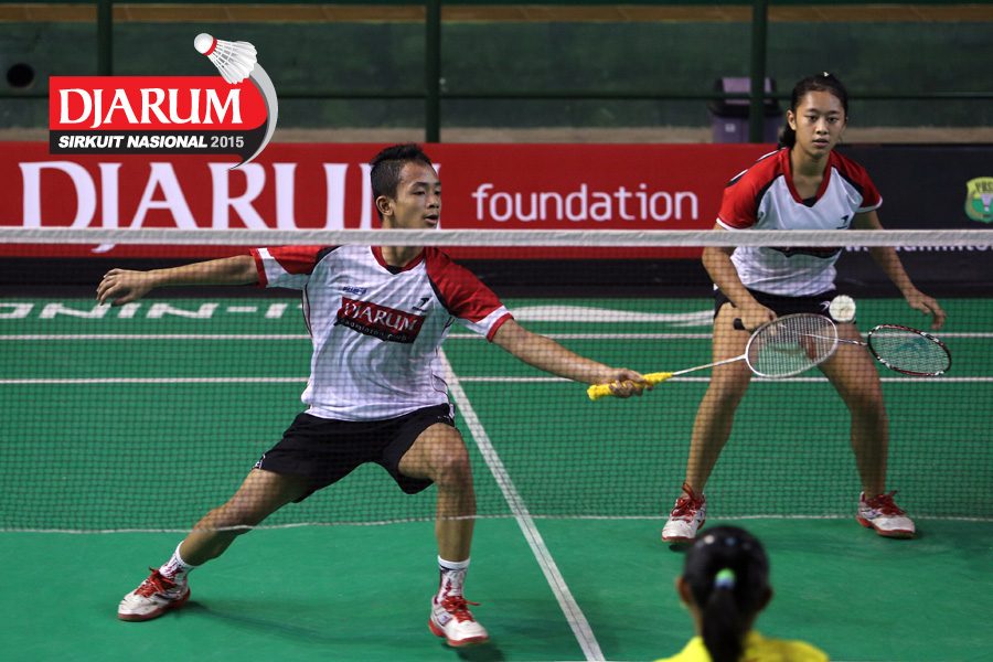 Galang Decky/Chintya Shara (Djarum Kudus) mengembalikan shuttlecock.