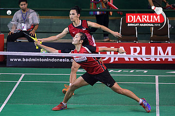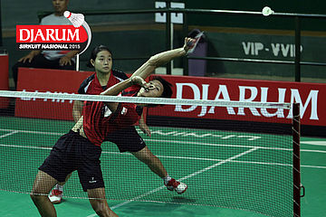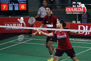 Tedi Supriadi/Ririn Amelia (Djarum Kudus) menghadang serangan.