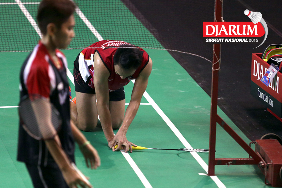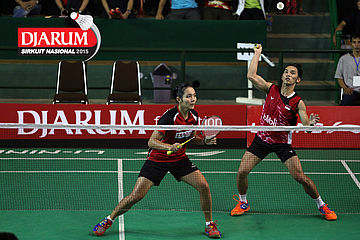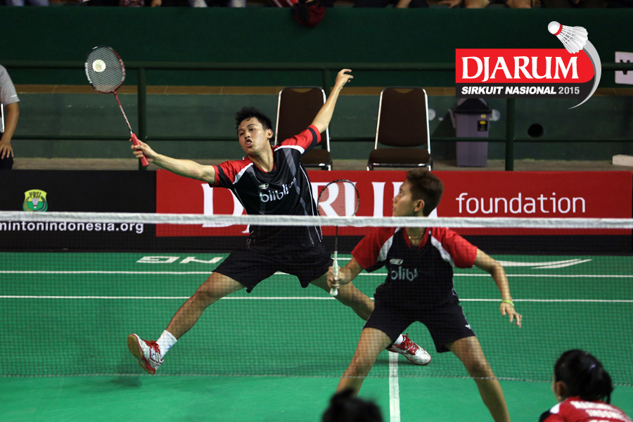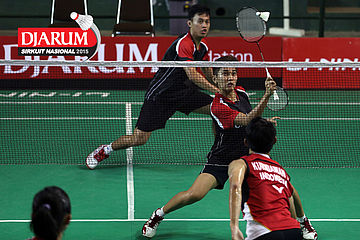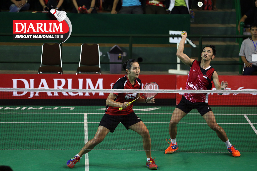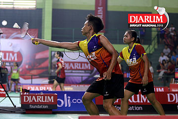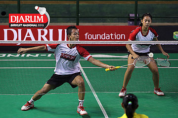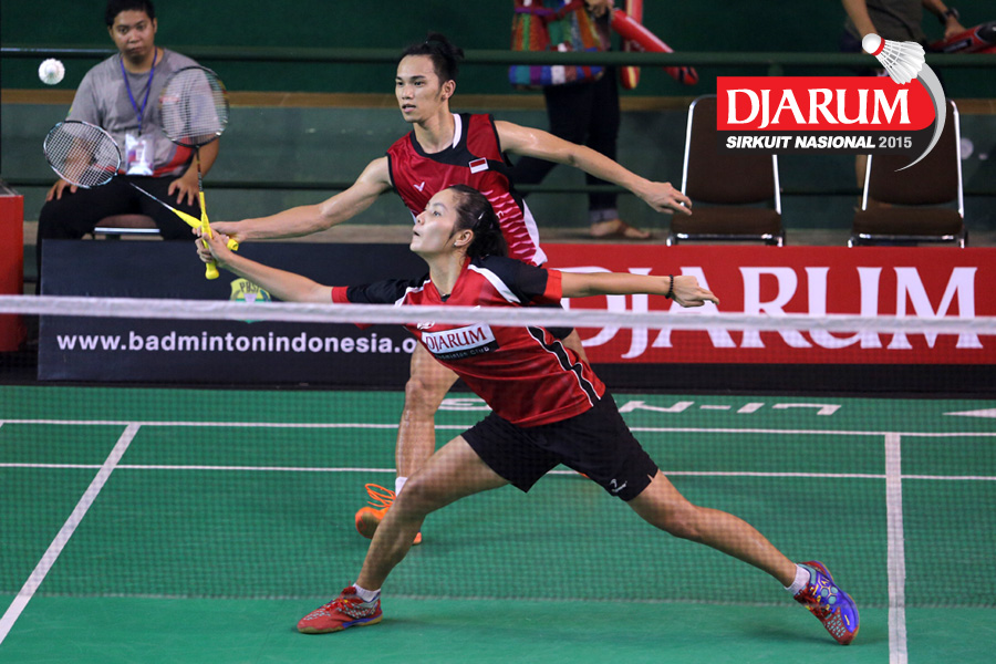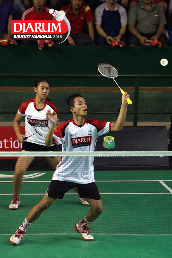 Tedi Supriadi/Ririn Amelia (Djarum Kudus) mengambalikan shuttlecock.