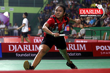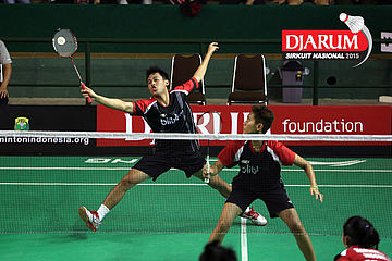 M. Taufiqul/Vanadia Pranasa (Djarum Kudus) bersiap menyambar pengembalian.